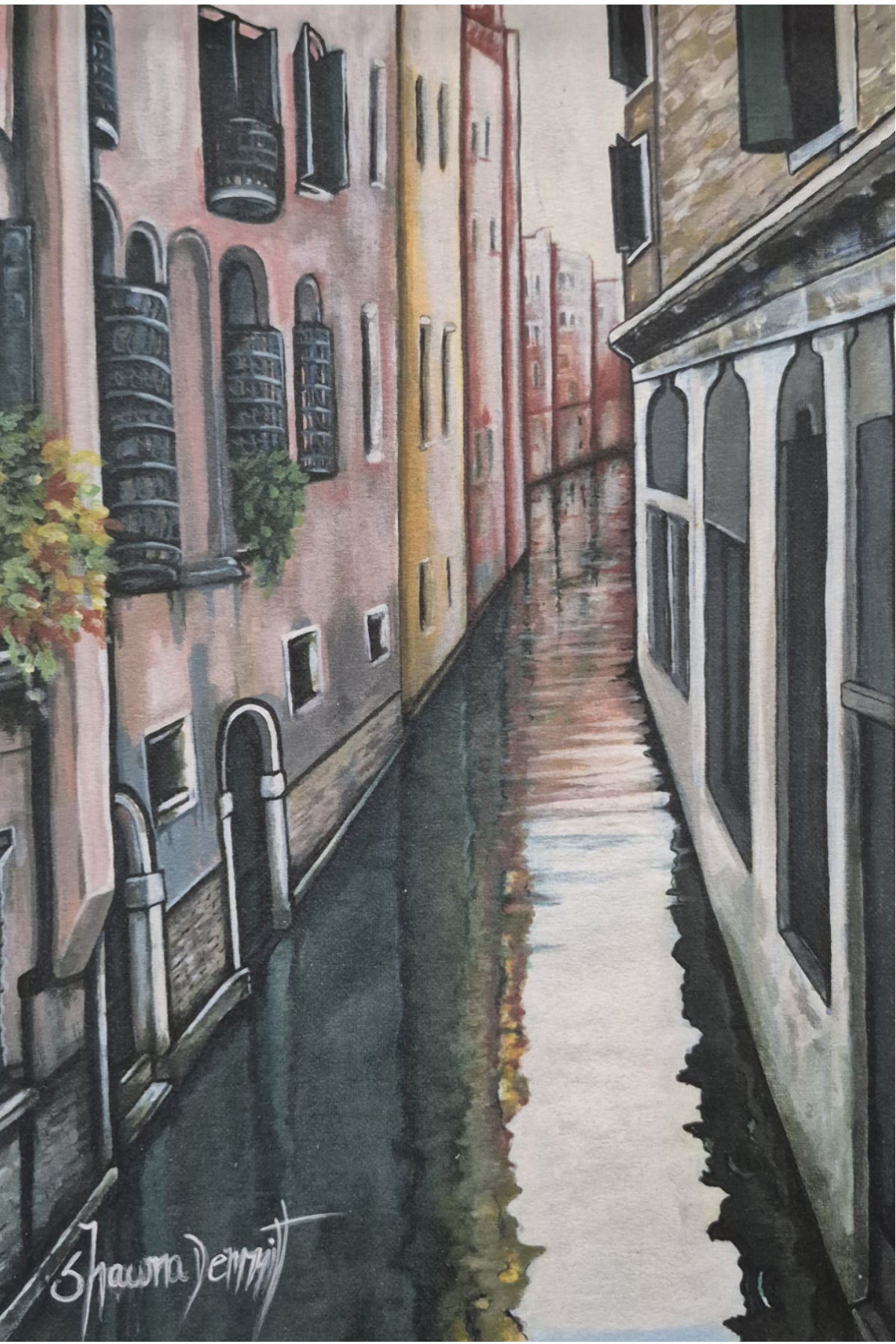 Venice Reflection is an original 16x20 acrylic painting on canvas of a tranquil Venice waterway.