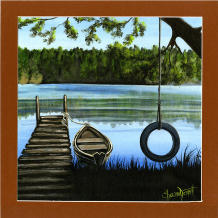 Escape to the lake any time you'd like with this boat dock acrylic painting! Tranquil waters and a cozy dock take you to a peaceful place. The art is mounted on 13"x13" black foam core and matted with a warm brown mat board — perfect for a cozy lake cabin or any lakeside living room.